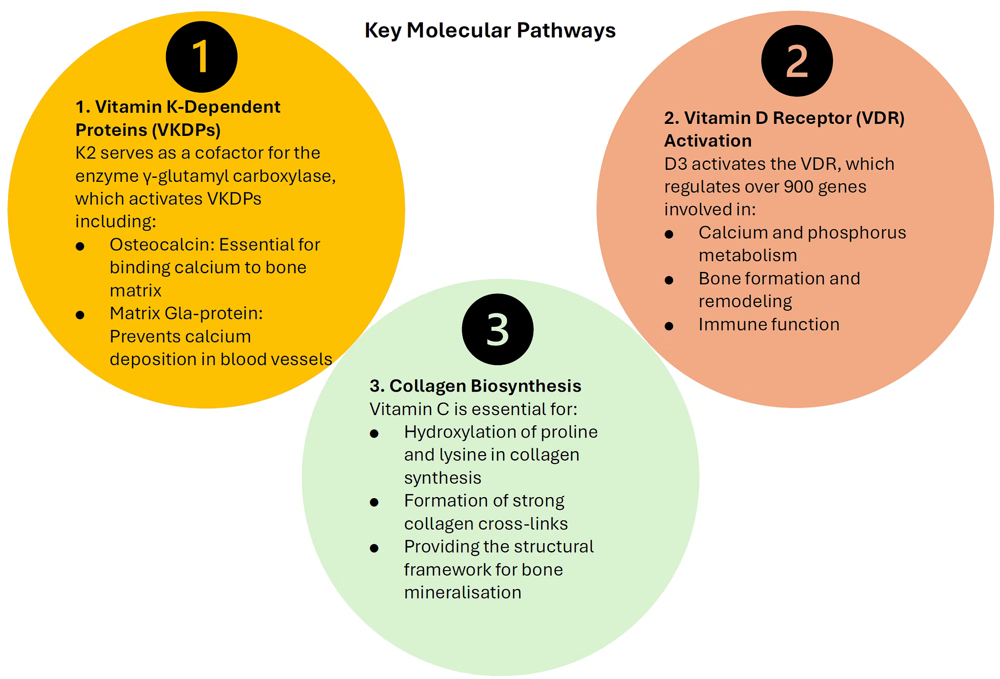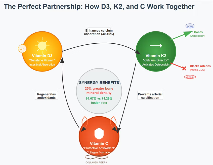 The synergistic relationship between vitamins D3, K2, and C operates through several sophisticated biochemical pathways: