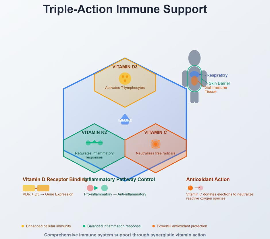 Research demonstrates this three-way synergy provides comprehensive support for bone health, cardiovascular function, and immune system response that exceeds what any single vitamin can provide.