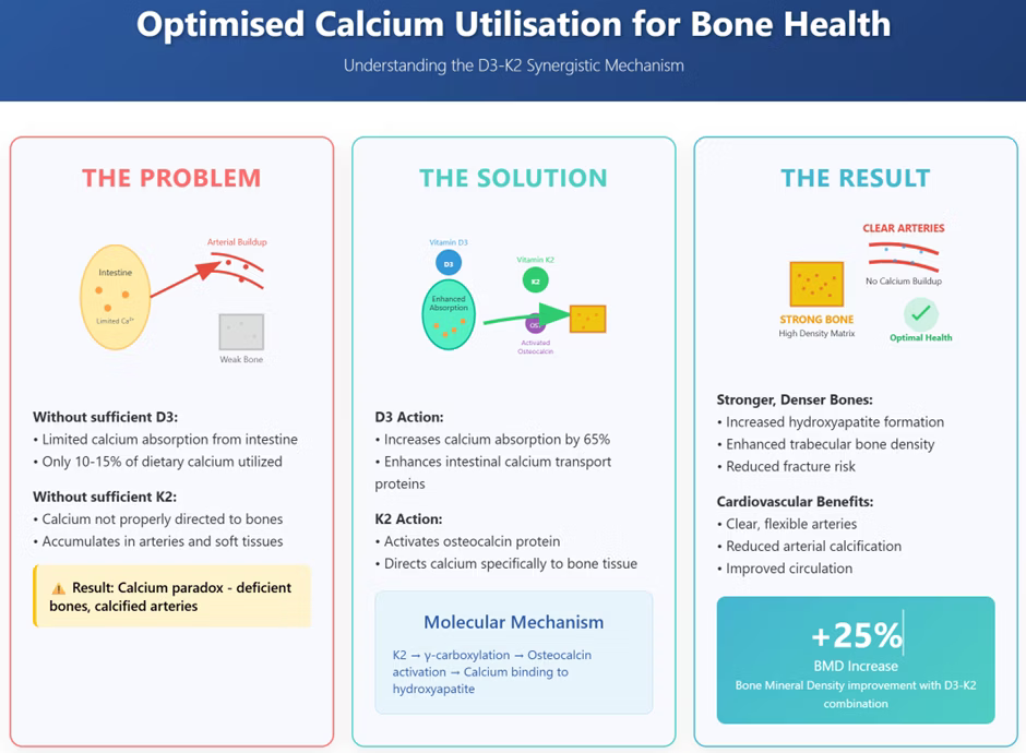 Standard supplements fail to address the critical relationship between these nutrients, with research showing D3 without K2 can lead to improper calcium utilisation and reduced overall effectiveness.
