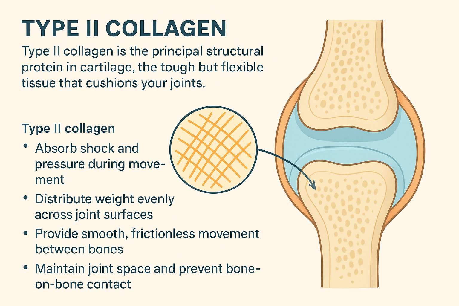 Type II collagen is the principal structural protein in cartilage, the tough but flexible tissue that cushions your joints. It makes up about 50-60% of cartilage’s dry weight and creates a mesh-like framework that provides both strength and elasticity.