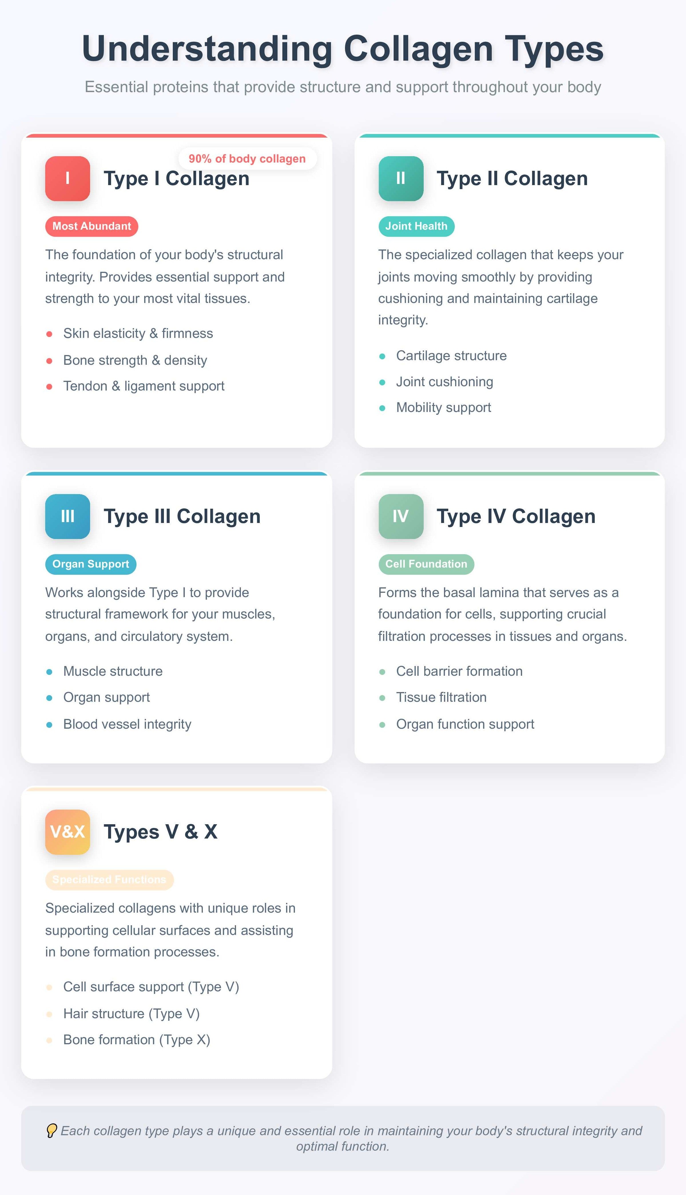 Collagen is the most abundant protein in your body, but not all collagen is the same. There are at least 28 different types, each serving specific functions: