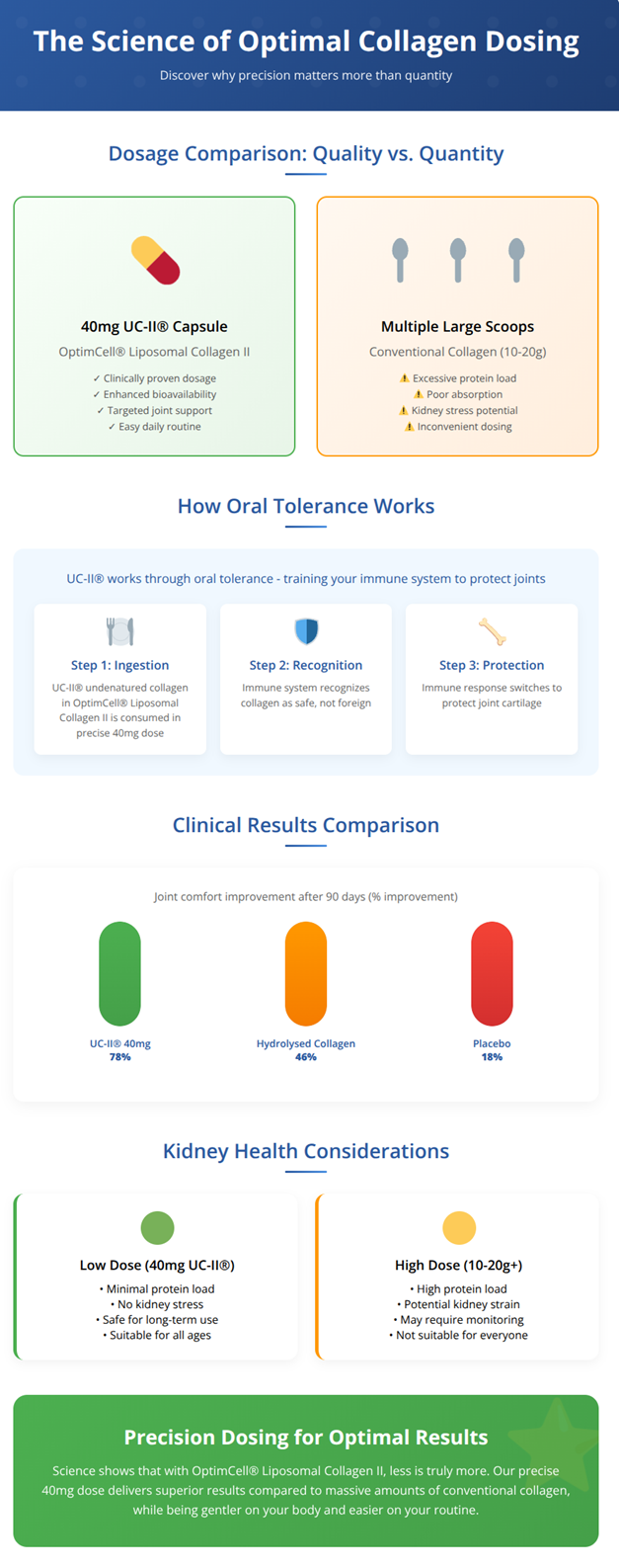 This immune-mediated approach is why UC-II® delivers superior results at just 40mg compared to massive 5-15g doses of hydrolysed collagen.