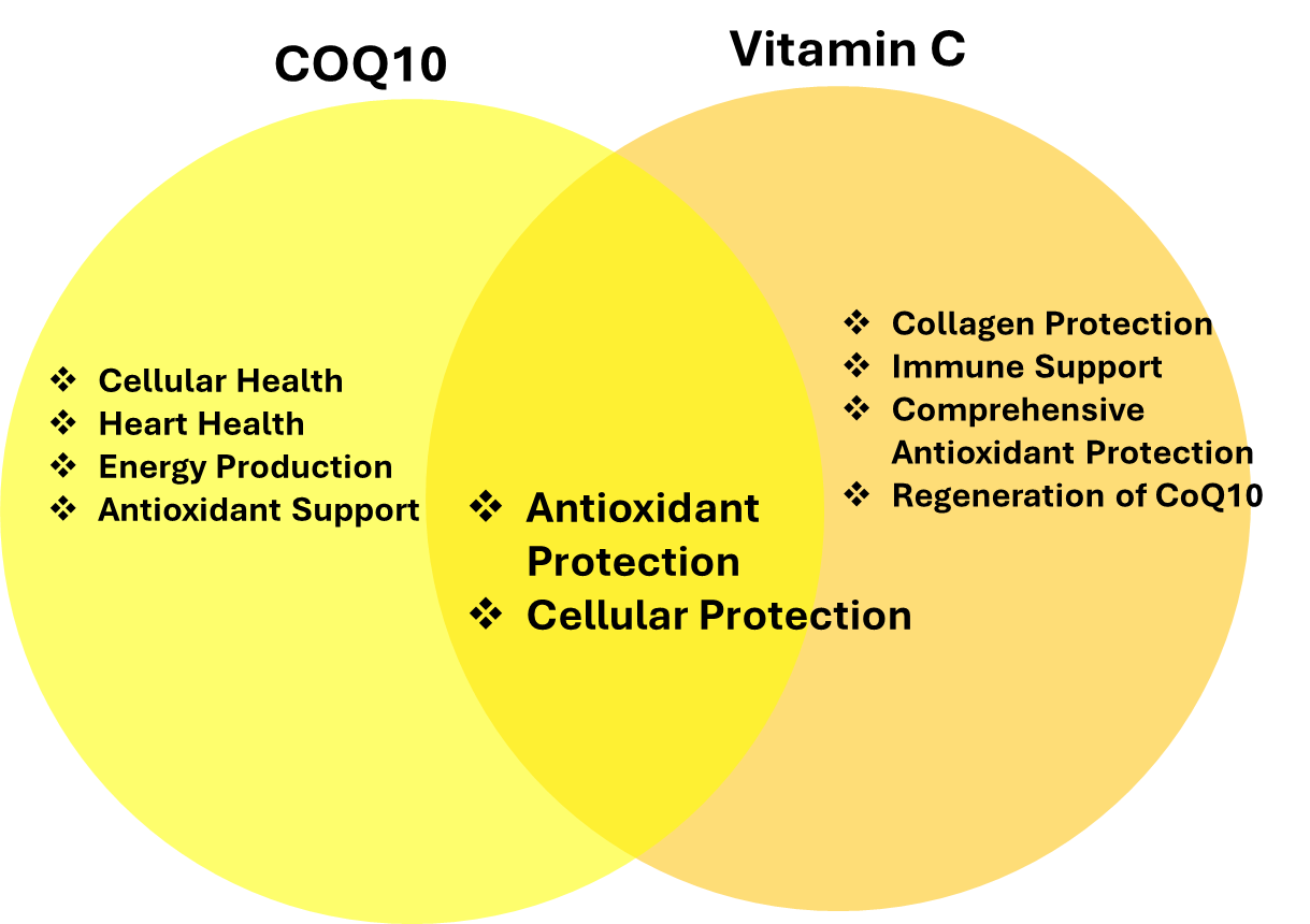 A: Vitamin C works synergistically with CoQ10, helping to regenerate it after it neutralises free radicals. This extends CoQ10’s antioxidant capacity while providing additional immune and collagen support benefits.
