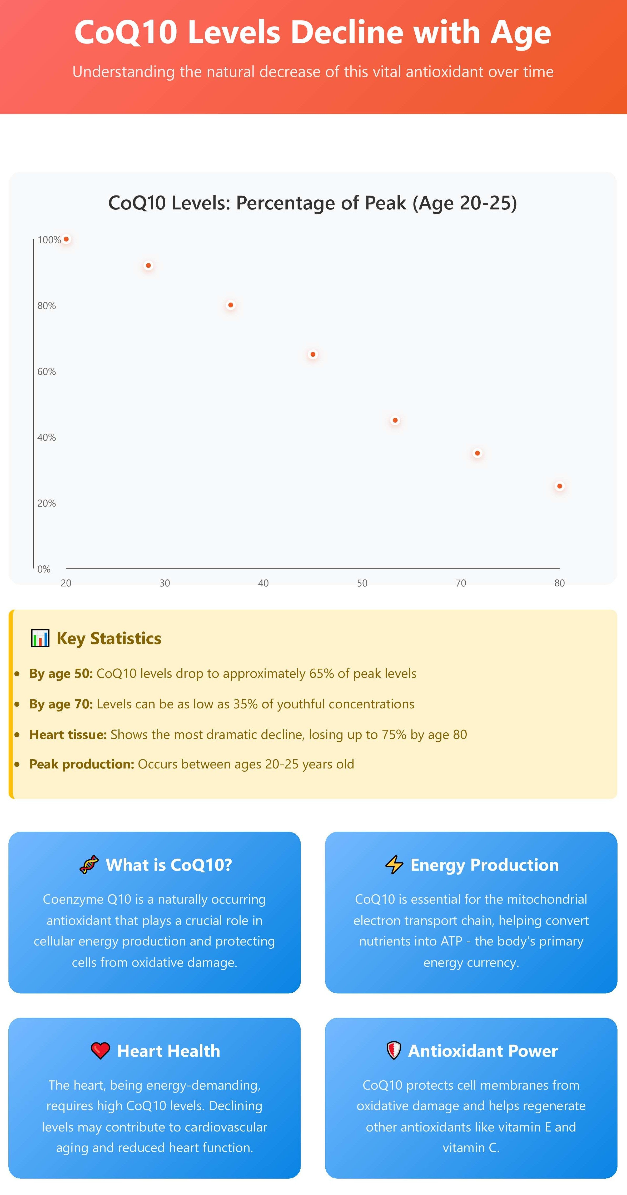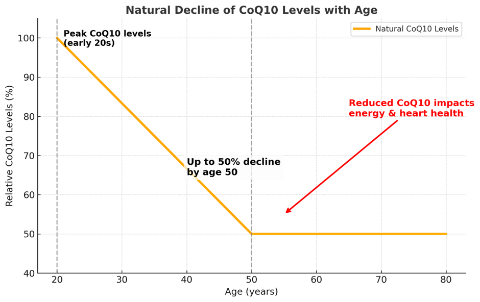 Antioxidant Protection: As a powerful antioxidant, CoQ10 helps protect your cells from oxidative damage caused by free radicals. This protection is particularly important for your cardiovascular system, where oxidative stress can contribute to heart health issues. Your natural CoQ10 levels peak in your 20s and then steadily decline. By age 50, your CoQ10 levels may be up to 50% lower than in your youth. This decline coincides with many age-related health concerns, particularly those involving energy levels and cardiovascular function. Several factors can further deplete your CoQ10 levels: