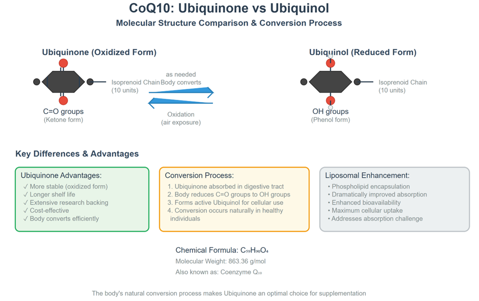 Did You Know? Your body naturally converts between Ubiquinone and Ubiquinol forms as needed, but this conversion becomes less efficient with age and certain health conditions.