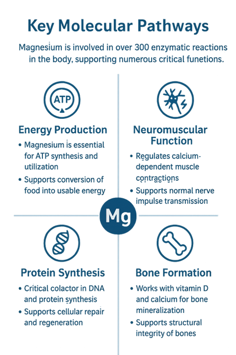 The Science: Magnesium plays a crucial role in energy production as a cofactor in ATP synthesis. Recent studies highlight magnesium’s fundamental role in binding ATP and activating numerous metabolic enzymes [4]. Research published in the Journal of Nutrition found that even mild magnesium deficiency can impair energy metabolism and increase oxygen requirements during physical activity [5]. The mineral directly influences cellular energy production, maintaining metabolic homeostasis across multiple organ systems [6].